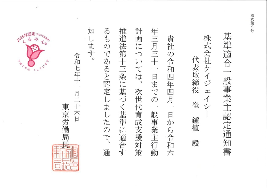 この度、当社は2025年11月26日付で子育てサポート企業として、