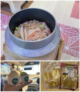 ↑昼食の蟹釜飯、おやつのジェラート(干し芋味と猿島茶味)、お土産の干し芋です♪