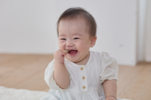 ↑くちどけおこめぼーを食べているモデル写真です。癒されます^^